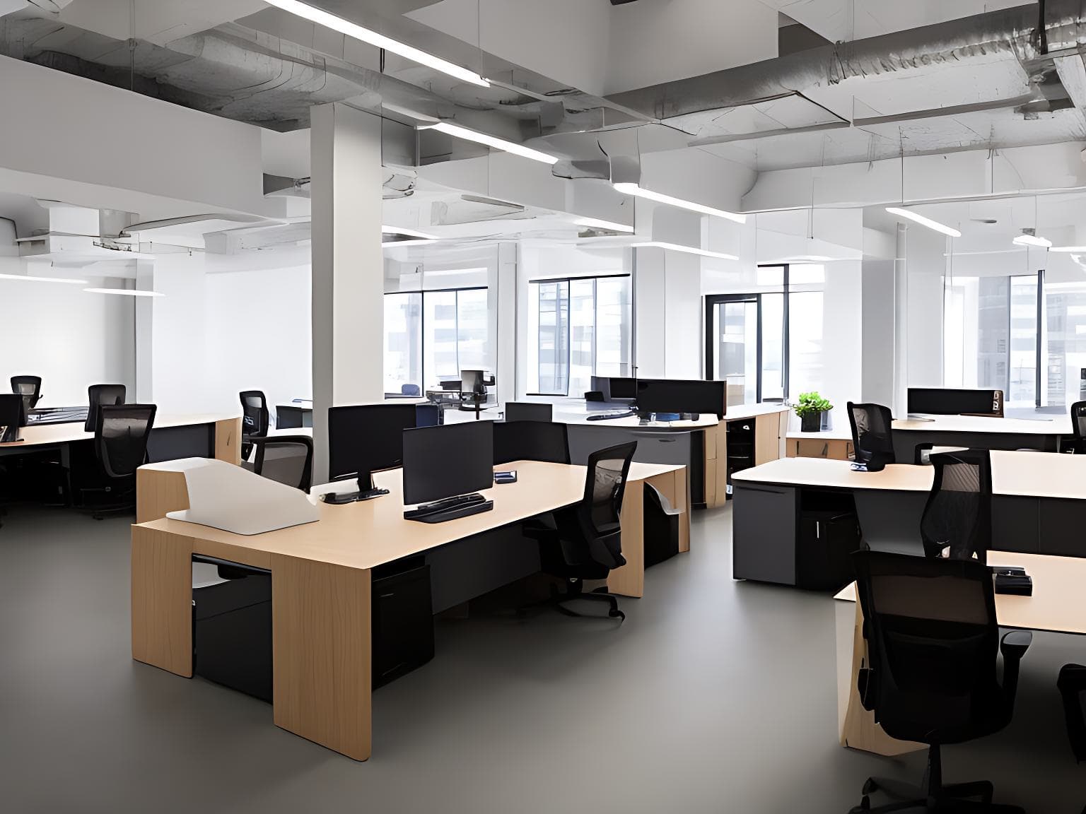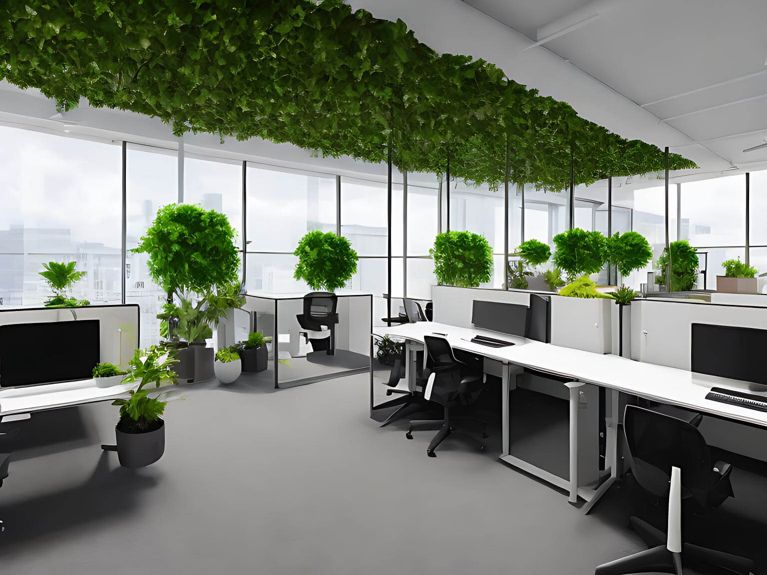 En nuestro segundo intento pedimos a la IA que agregara más plantas y que hiciera las oficinas más "acogedoras". Los resultados poco a poco empezaban a mejorar y las oficinas empezaban a tener un toque más humano.